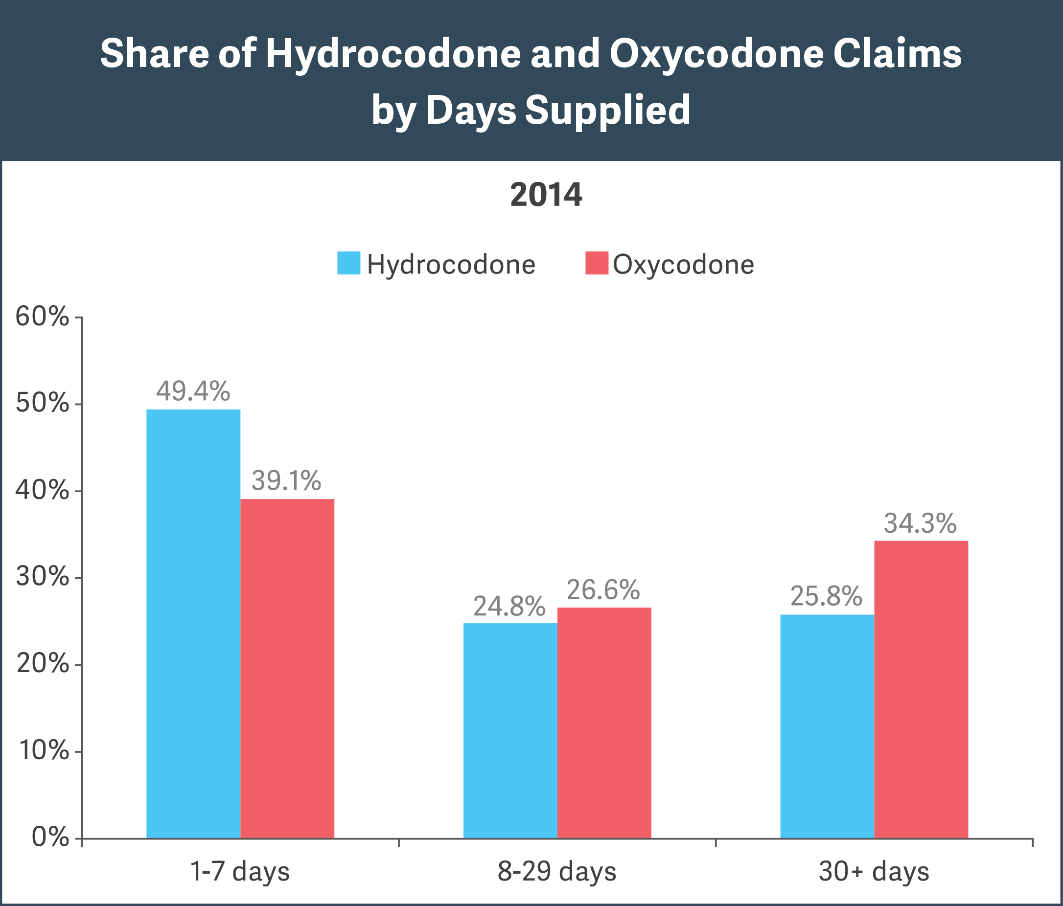 - Adopting the more stringent CDC guideline will likely result in a significant reduction in average days supplied per prescription. The CDC advises that, for acute pain, more than a 7-day supply of opioids “will rarely be needed.” Our analysis found that 50 to 60 percent of oxycodone/hydrocodone prescriptions exceed the 7-day recommendation, with 25 to 35 percent having a 30-day supply. (See figure.)