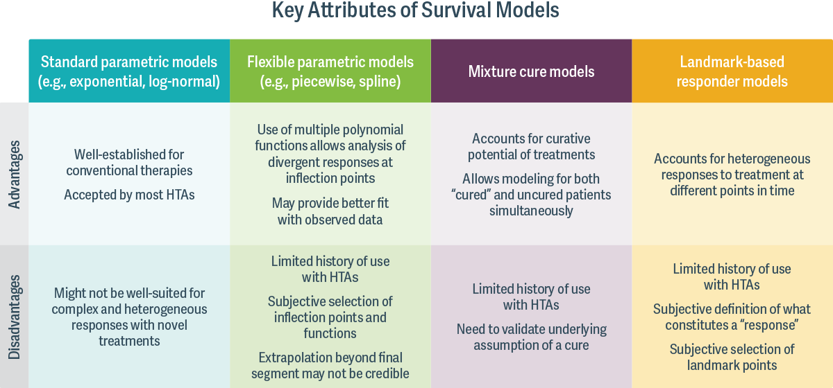 Each model has its pros and cons. (See table.) However, all aim to account for more complex survival trajectories and address the issue of a lack of long-term survival data. The choice of which statistical model should be applied and what inputs should be provided must be carefully considered, as it can significantly affect predictions of long-term value. ■